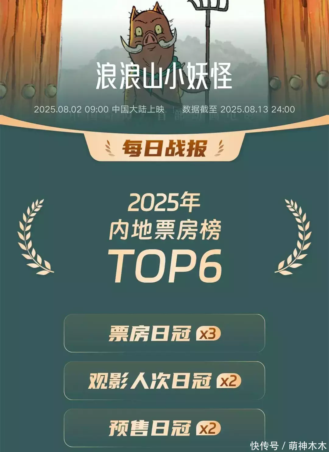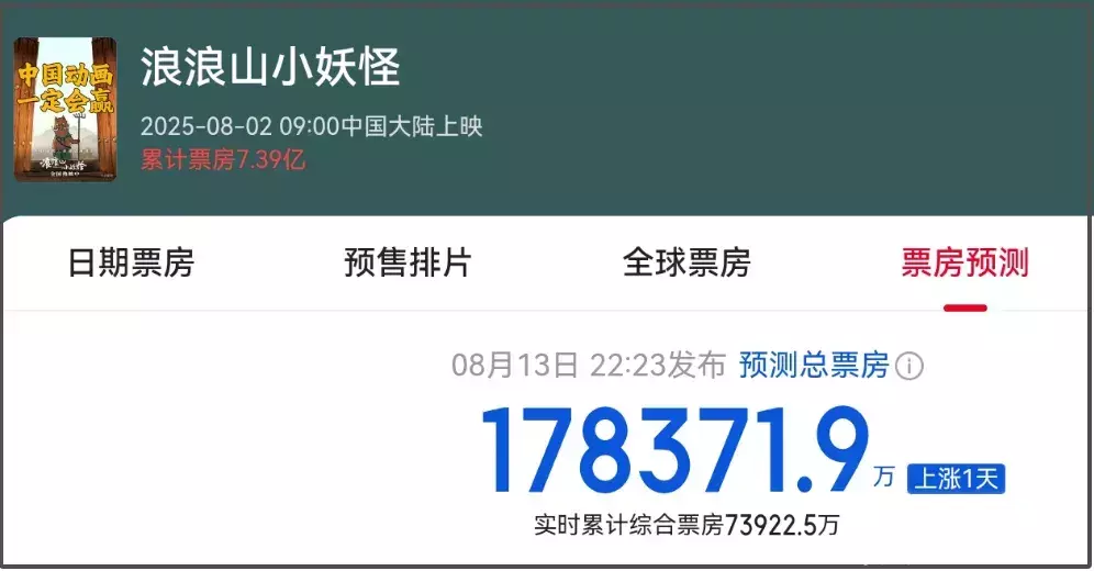 目前《浪浪山小妖怪》总票房眼见着就要突破7.5亿,预测票房上涨到了17.83亿,有望成为2025年暑假档票房亚军,因为宣发引发争议遭到抵制之后,《浪浪山》连续三天拿下日票房冠军,其中一天更是拿到了单日票房和观影人次双日冠。