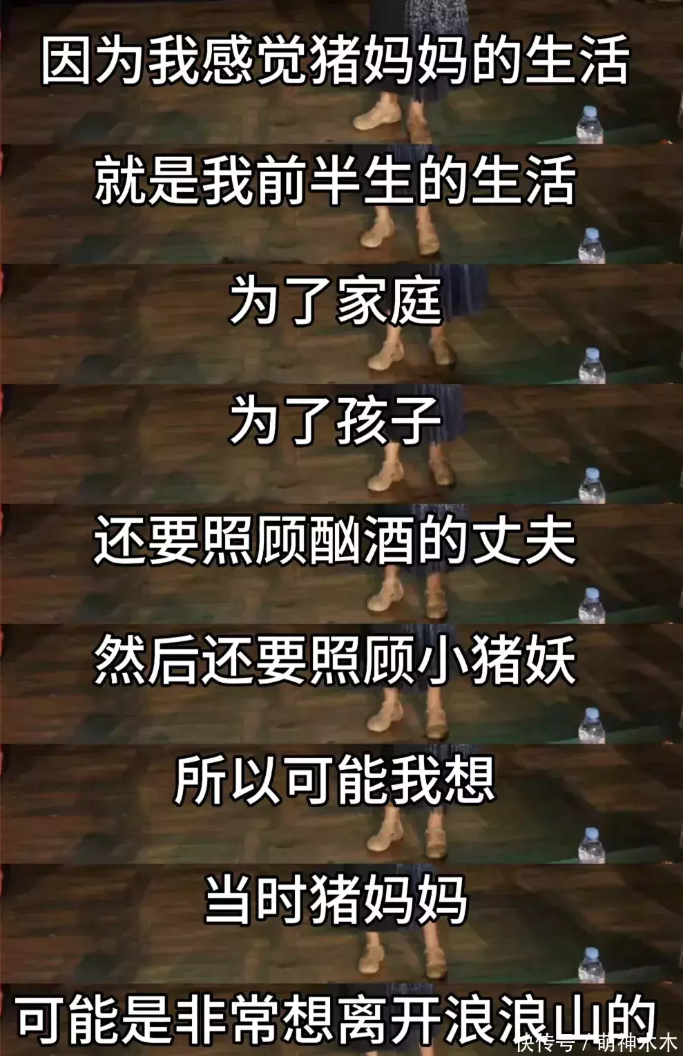 在苏敏阿姨看来,猪妈妈的生活像极了她的前半生,一直都为了家庭和孩子付出,她看到了猪妈妈的牺牲,代入自身想到也许猪妈妈同样想过要成就一番事业,可惜被酗酒的丈夫、嗷嗷待哺的儿子拖住了脚步,所以苏敏阿姨希望,如果有机会猪妈妈也可以走出浪浪山,成为自己人生的主角,就像《浪浪山》里面的一句话:“我想要活成我喜欢的样子。”